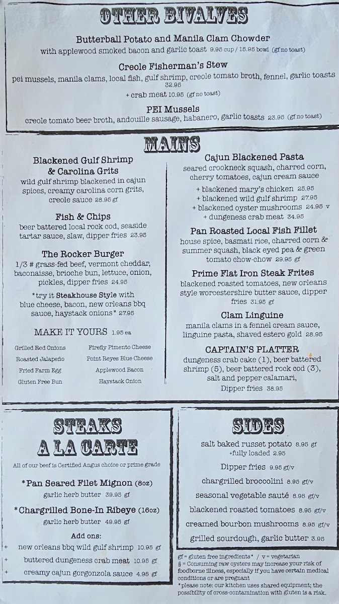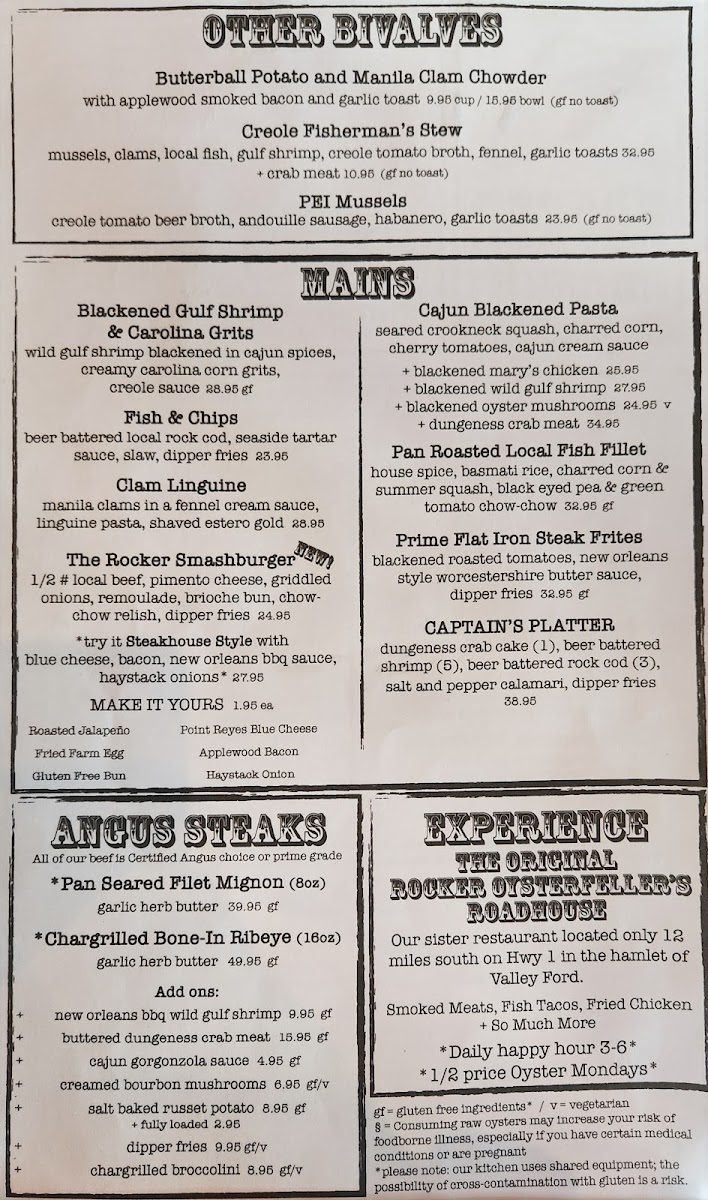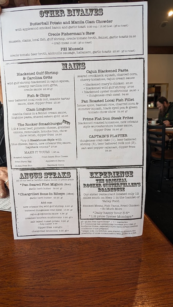 If you're in Bodega Bay, make sure to stop by Rocker Oysterfeller's At The Wharf for a dining experience you won't forget. Nestled along the beautiful California coastline at 595 CA-1, Bodega Bay, this spot offers a menu packed with fresh, flavorful dishes that highlight the best of the region's seafood. From succulent oysters to mouthwatering seafood platters, there's something for every seafood lover to enjoy. But it's not all about the ocean's bounty-there's also a great selection of hearty, comfort foods and tasty sides to complement your meal. Whether you're in the mood for a light snack or a full dinner, the menu here is all about keeping things relaxed and delicious. And with a view of the wharf, every bite tastes just a little bit better.