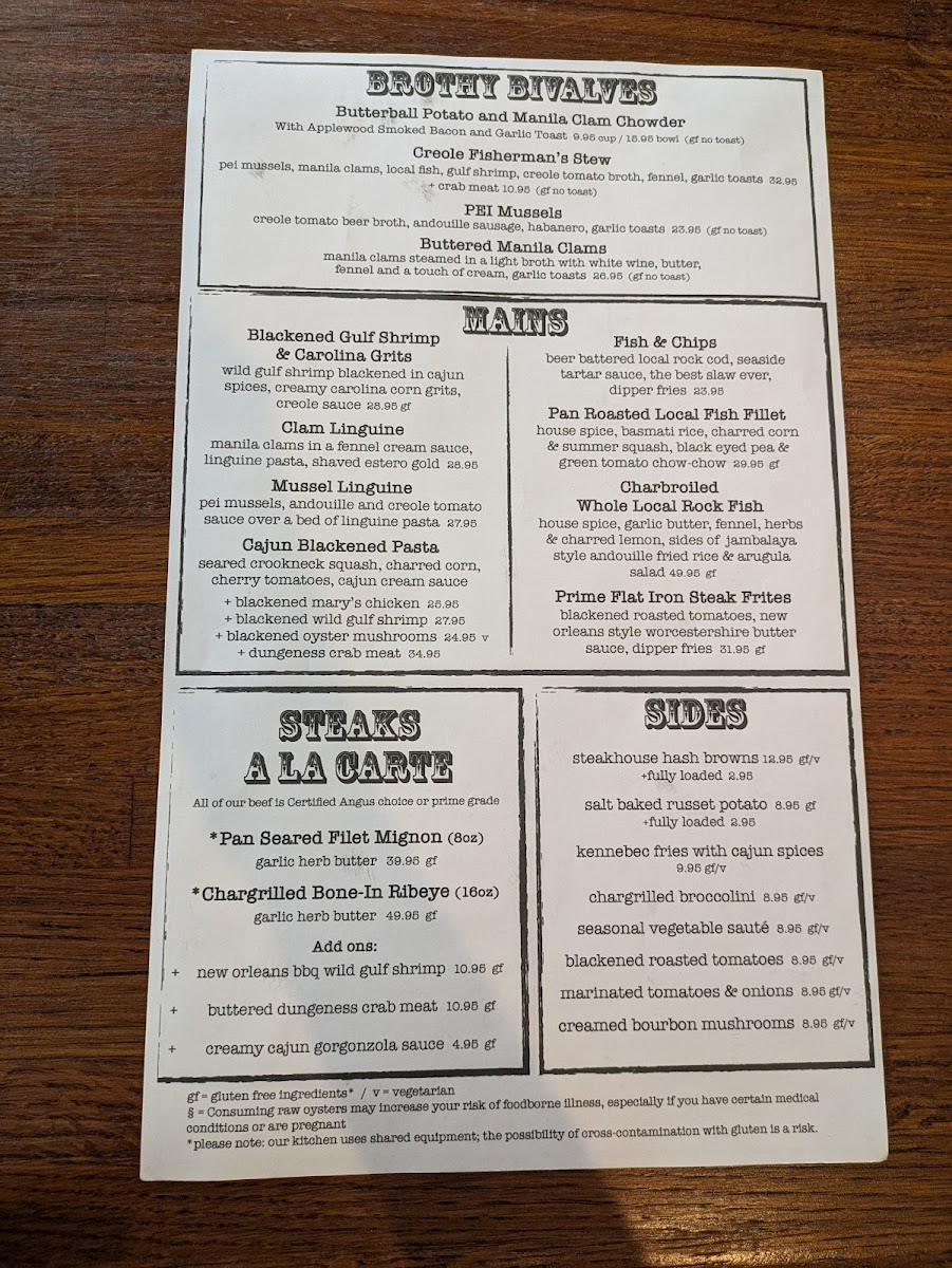 Creole Fisherman’s Stew starbird mussels, manila clams, local fish, gulf shrimp, creole tomato broth, fennel, served with 2 pieces of garlic bread Add Buttered Crab Meat